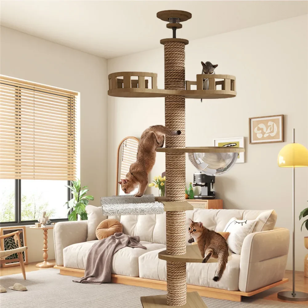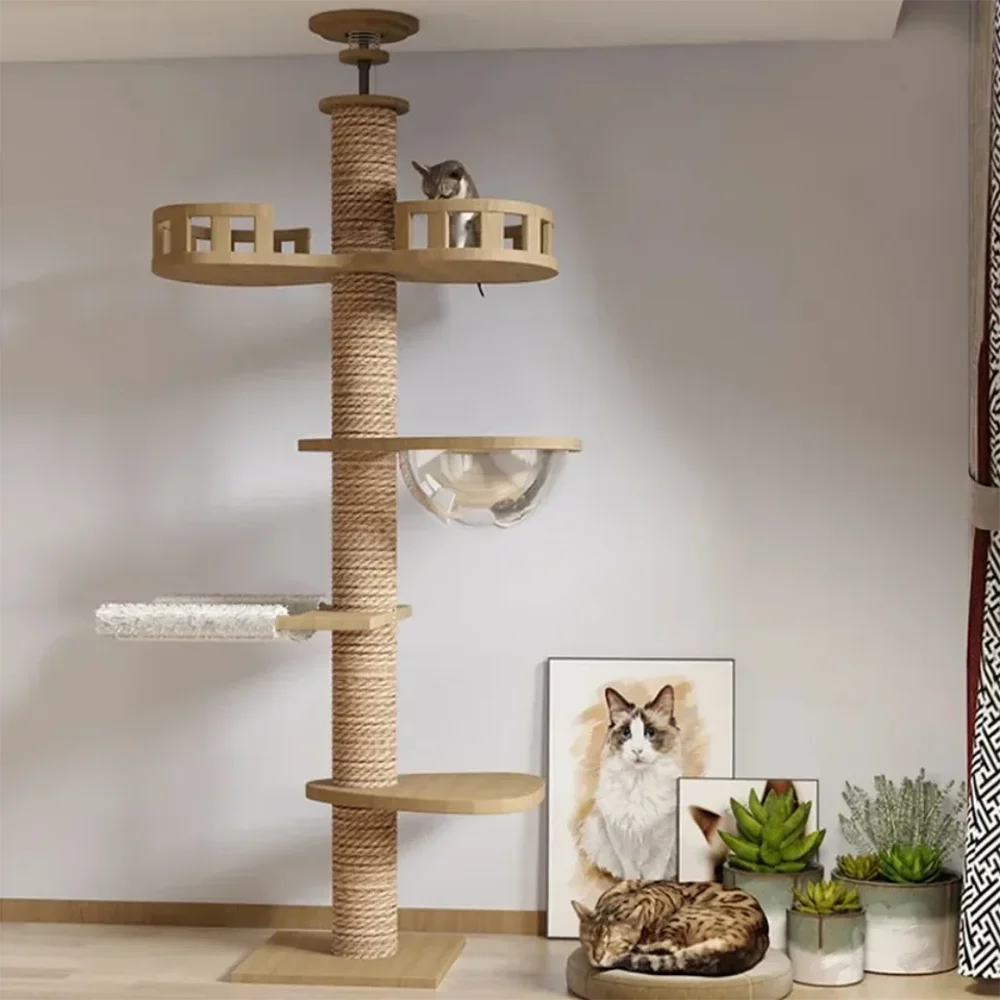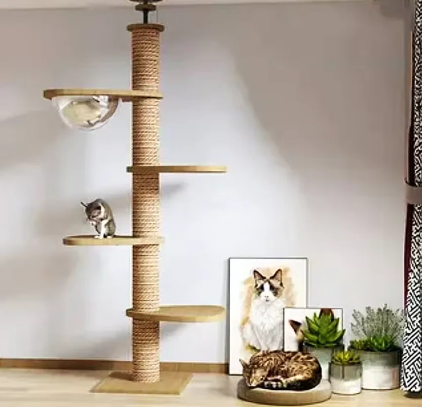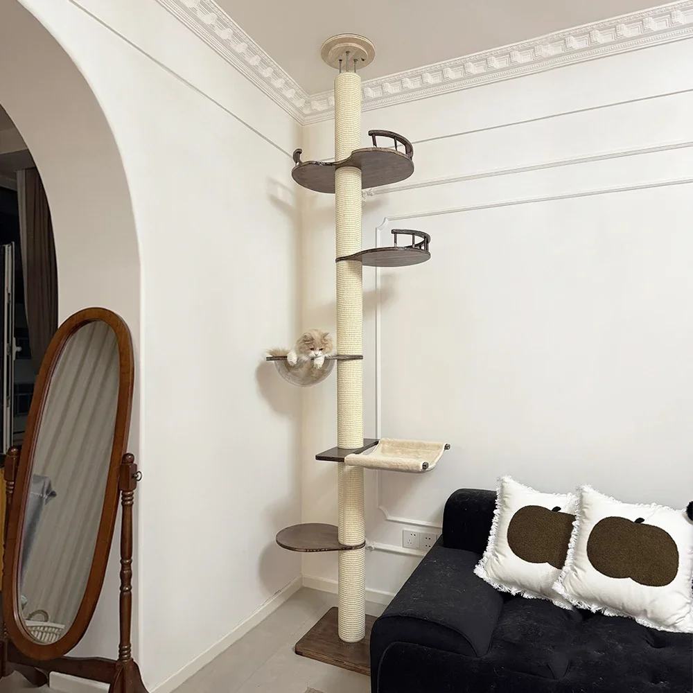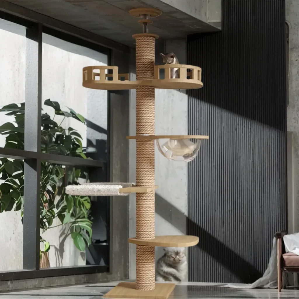The wooden structure is combined with natural elements to present a simple, raw wood style that is suitable for a variety of interior decorations. The stable floor-to-ceiling design saves space, the sisal material is wear-resistant and durable, and the wooden frame has strong load-bearing capacity, combining safety and aesthetics.